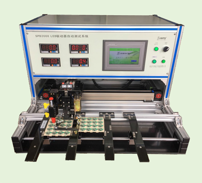 SPD2000 LED power automatic test system, which sets intelligent manipulator, input and output tester, man-machine interface, quickly and accurately measure LED input power, input power factor, output voltage, output current, and according to the preset parameters and lower limit values to be qualified, unqualified automatic marking, and save the total number of tests and the total number of tests. The total number of unqualified. Convenient and quick.